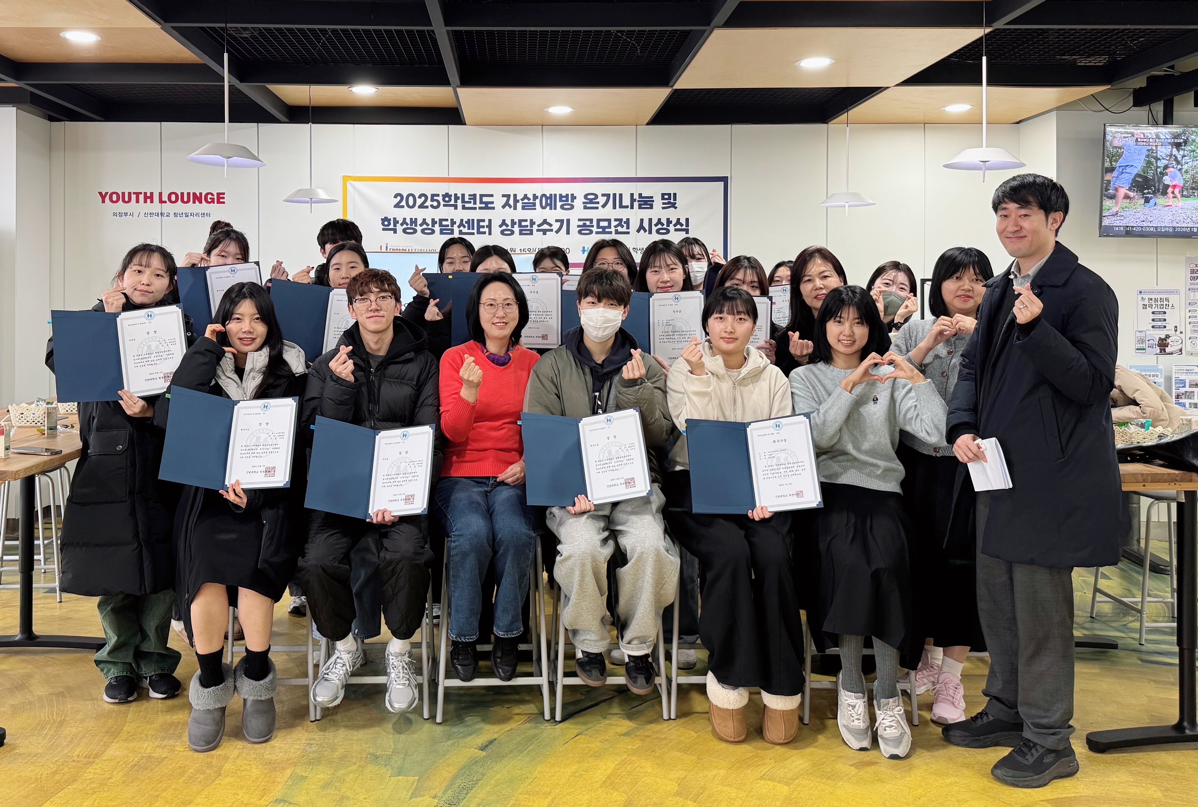 신한대학교(총장 강성종) 학생상담센터(센터장 이현종)2026115일 교내에서 ‘2025학년도 자살예방 · 상담수기 공모전을 개최했다. 이날 시상식에는 학생상담센터장을 비롯한 전임 상담원들과 공모전에 참여한 재학생 20여 명이 참석해 생명 존중과 마음 돌봄의 의미를 나누는 시간을 가졌다. 이번 행사는 온기-나눔 자살예방 공모전디딤돌 상담수기 공모전의 우수작을 시상하고, 창의적인 아이디어와 진솔한 경험을 공유함으로써 교내 정신건강 인식 제고와 생명 존중 문화 확산을 도모하기 위해 마련됐다.